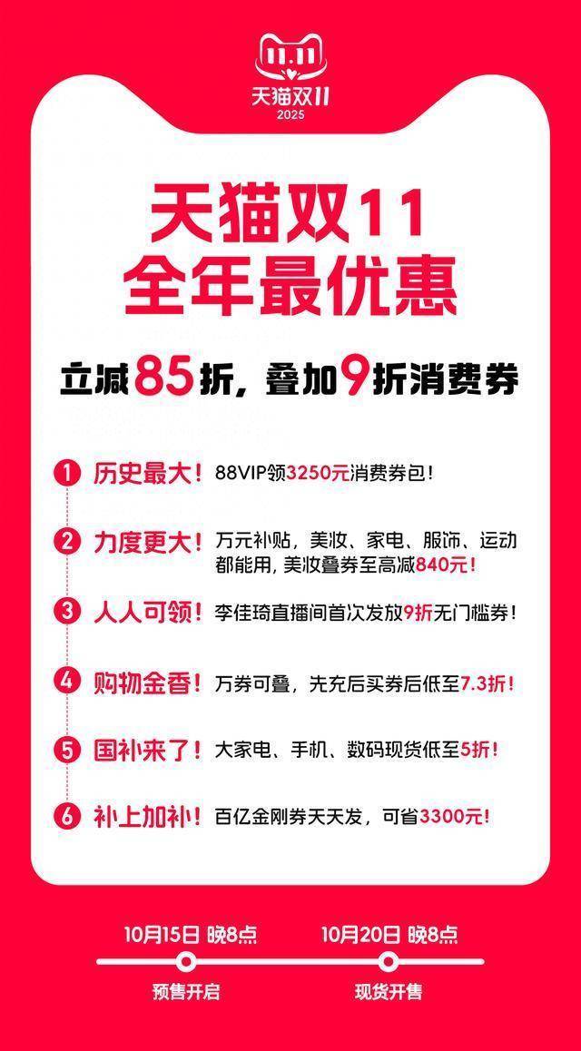 今晚8点,天猫双11预售开启,10月20日晚8点,可付尾款,正式现货开卖。无门槛加“叠中叠”。